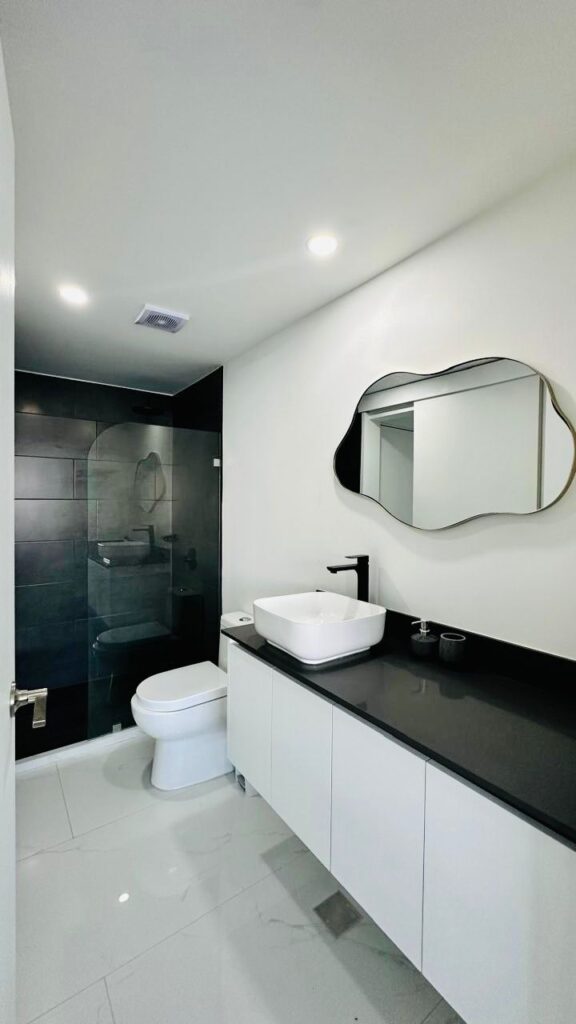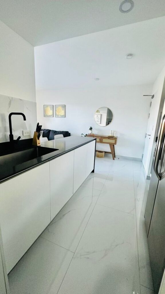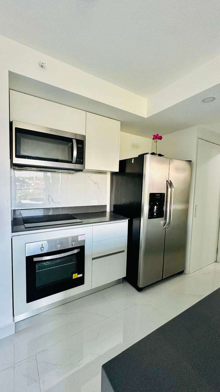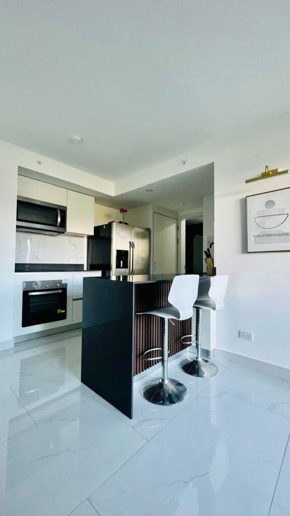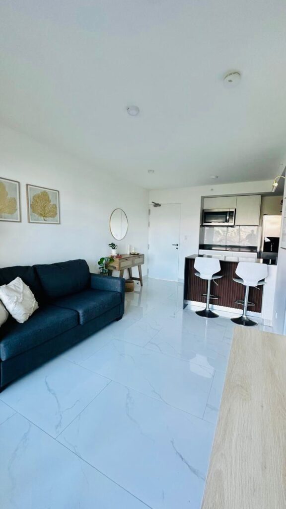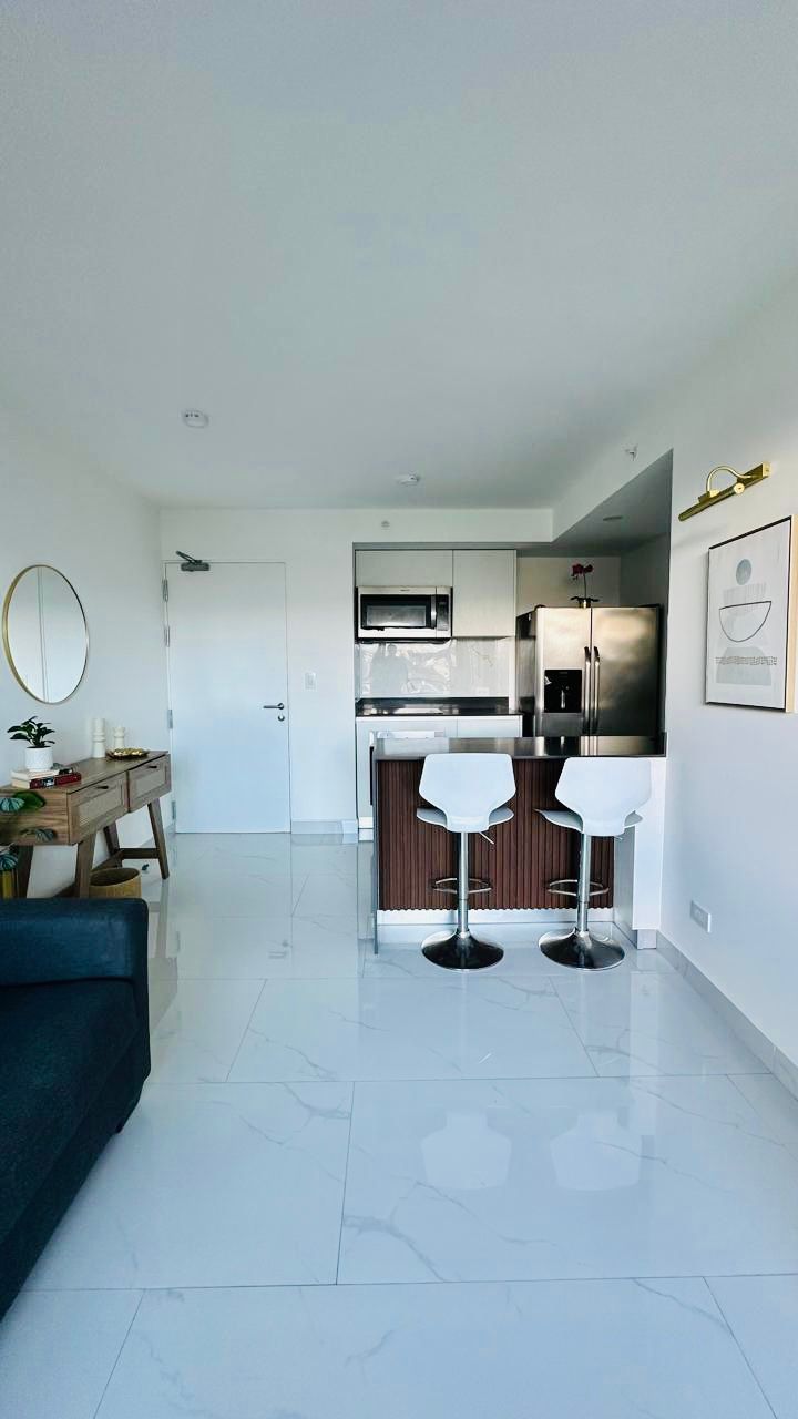 1 habitación amplia con closet, 1 baño completo, sala de comedor y estar, cocina con mueble y sobre de cuarzo, área de lavado, balcón y 1 garaje.