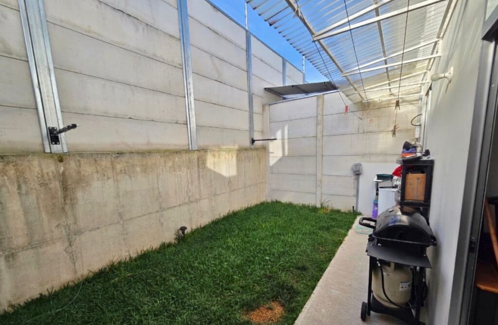4 habitaciones, 2 baños completos, sala de comedor y estar, sala de TV en el primer piso tanto como otra sala de TV en el segundo piso, cocina con mueble y sobre en granito, área de lavado, patio con zacate, jardín, agua caliente en toda la casa y cochera para 2 carros bajo techo.