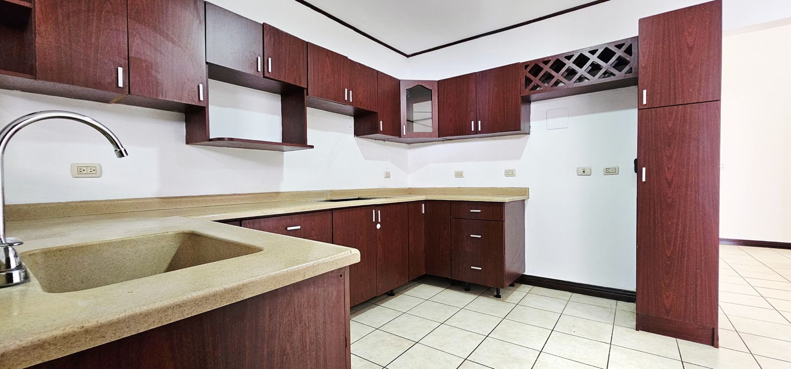 3 dormitorios con closet y baño, 2 baños completos, cocina con mueble y sobres en granito, sala de comedor y sala de estar, patio, área de lavado, jardín delantero y cochera para 2 vehículos bajo techo con portón eléctrico.