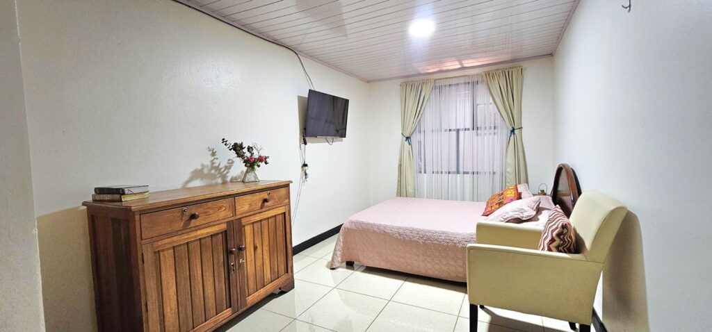Cuenta con 5 dormitorios, 2 baños completos, cocina con mueble, cuarto de pilas, sala de comedor y estar, sala de televisión, patio amplio enzacatado, jardín delantero y cochera para 2 carros.