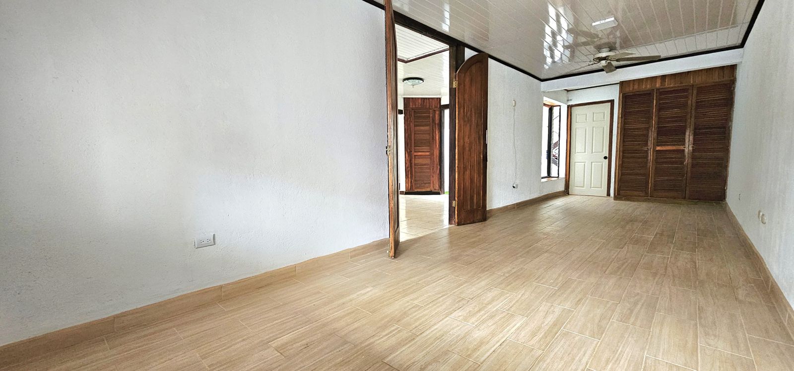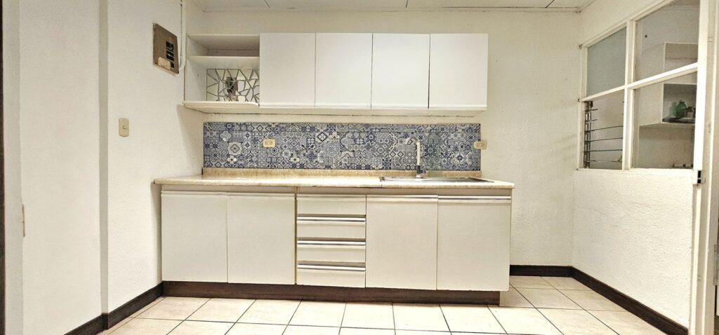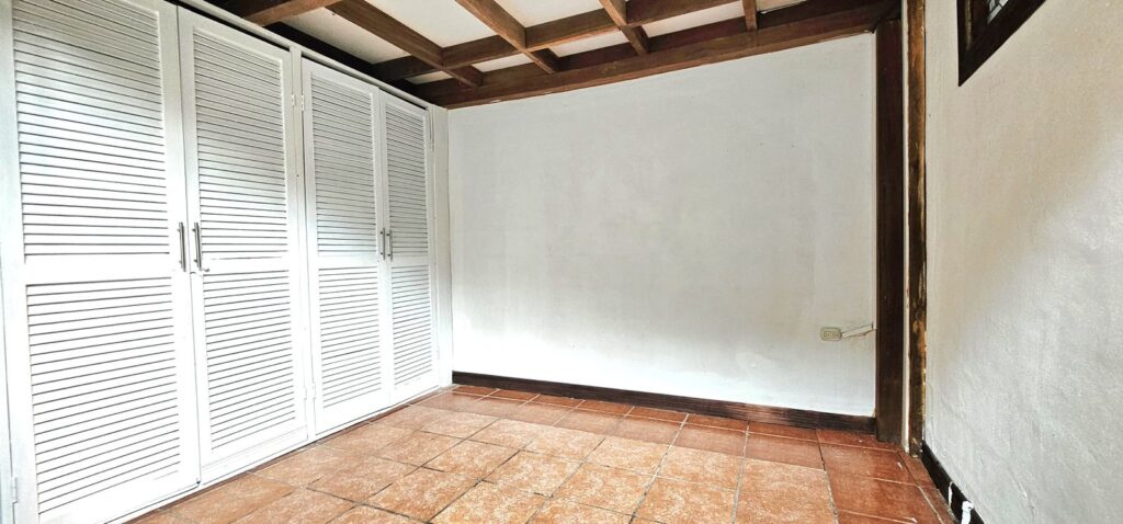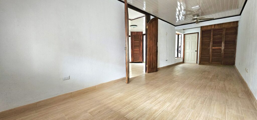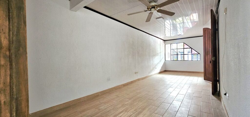 2 dormitorios con closet (con espacio para hacer una tercera habitacion más), 2 baños completos, cocina con mueble, sala de comedor y sala de estar, mezanine que puede ser utilizado para una oficina, bodega, área de lavado y cochera para 2 vehículos bajo techo con portón eléctrico.