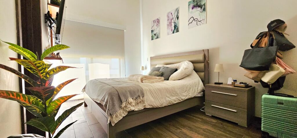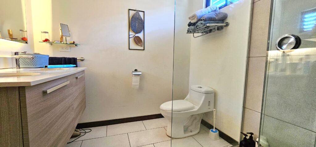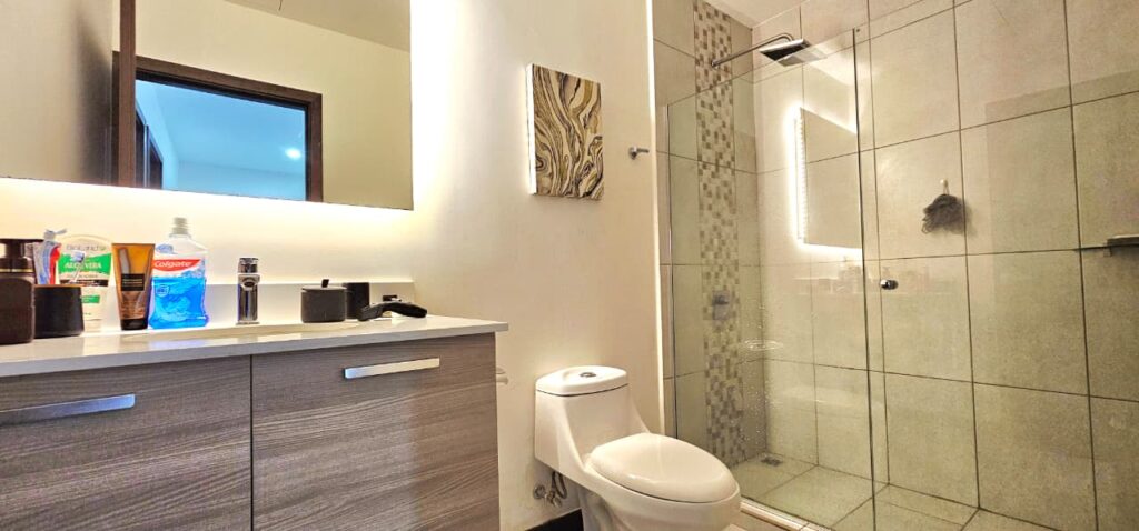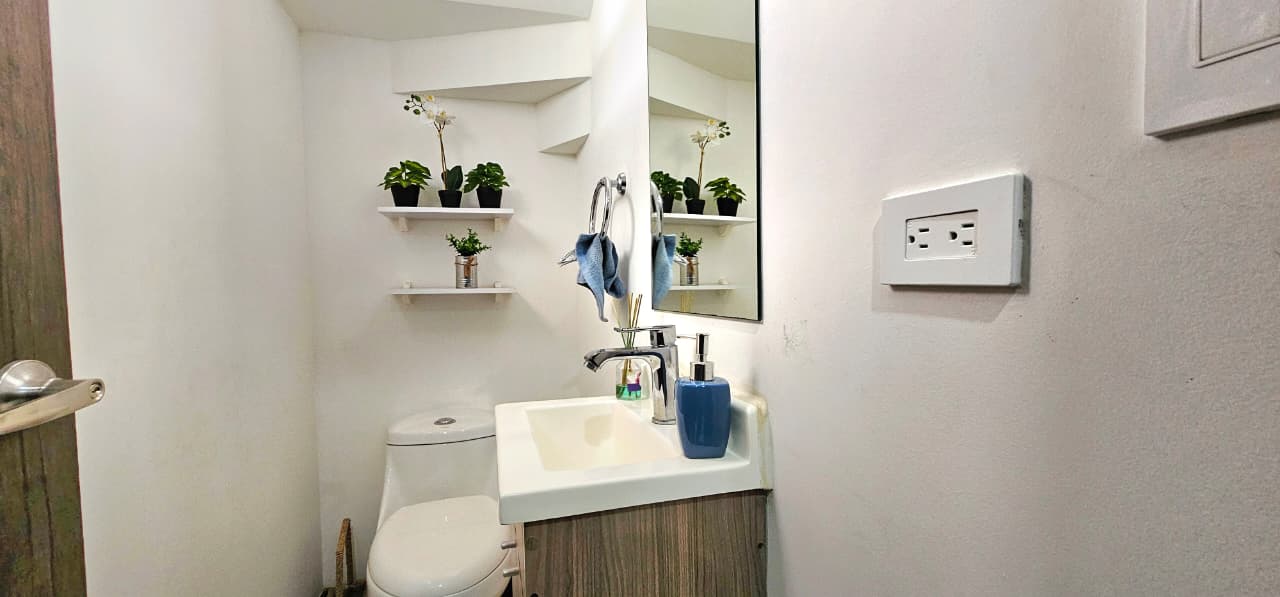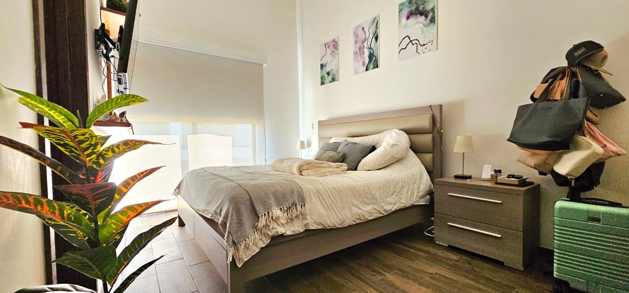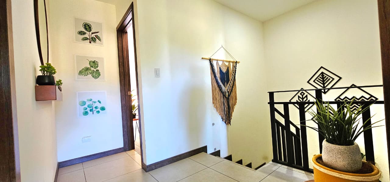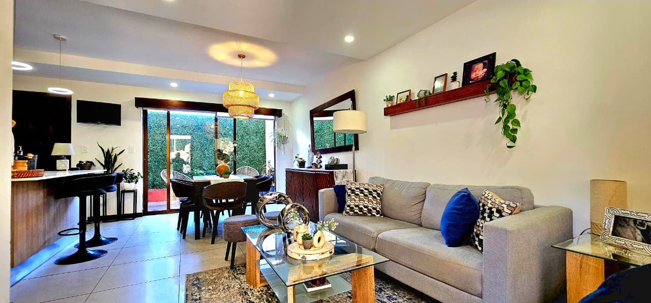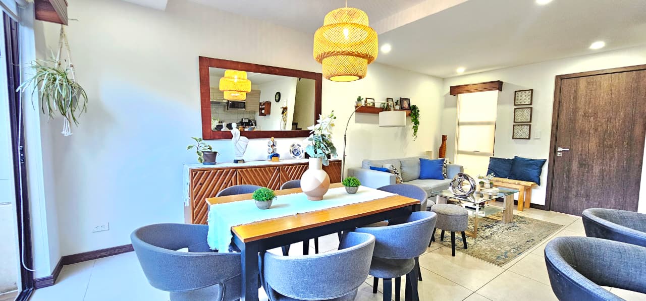 3 habitaciones con closet (principal con baño y walk-in closet), 2.5 baños, sala de comedor y estar, sala de TV, cocina con mueble y sobre en cuarzo, área de lavado, terraza, ático, bodega, agua caliente en toda la casa y cochera para 2 carros bajo techo.