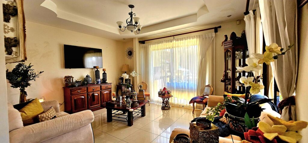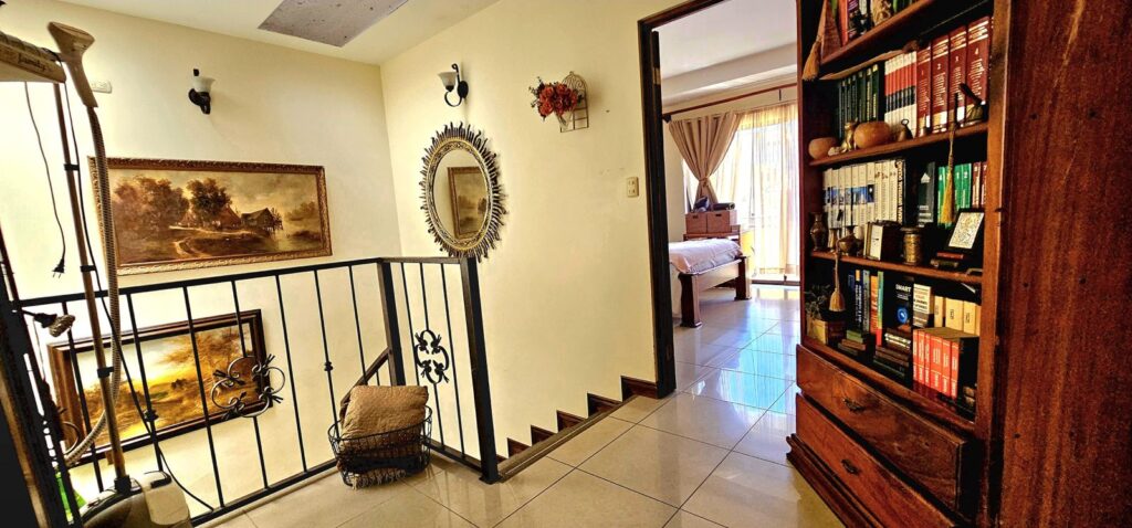 3 habitaciones con closet (principal con baño y walk-in closet), 2.5 baños, sala de comedor y estar, sala de TV, cocina con mueble y sobre en granito, área de lavado, 2 terrazas, jardín frontal, balcón, agua caliente en toda la casa y cochera para 4 carros.