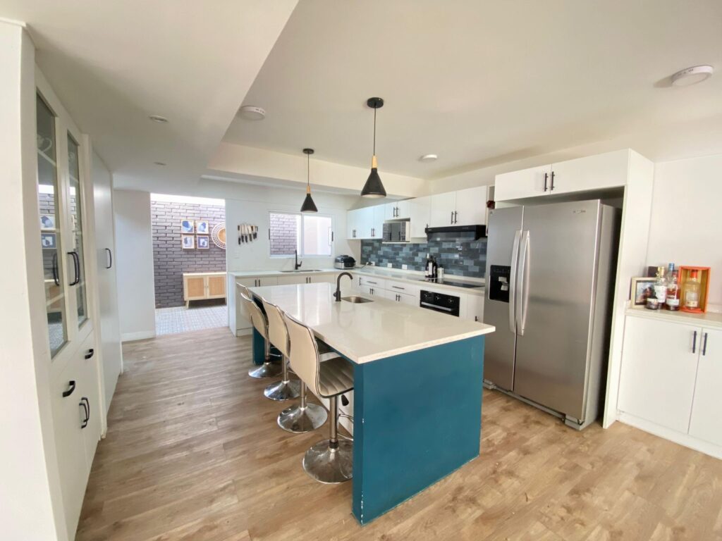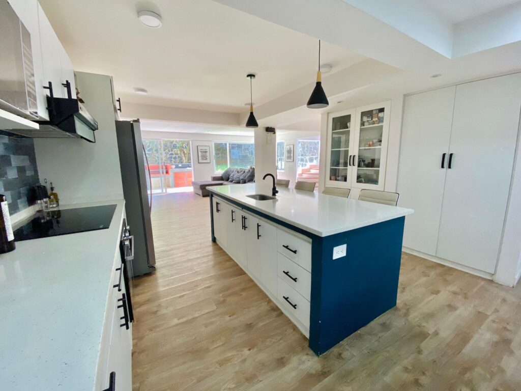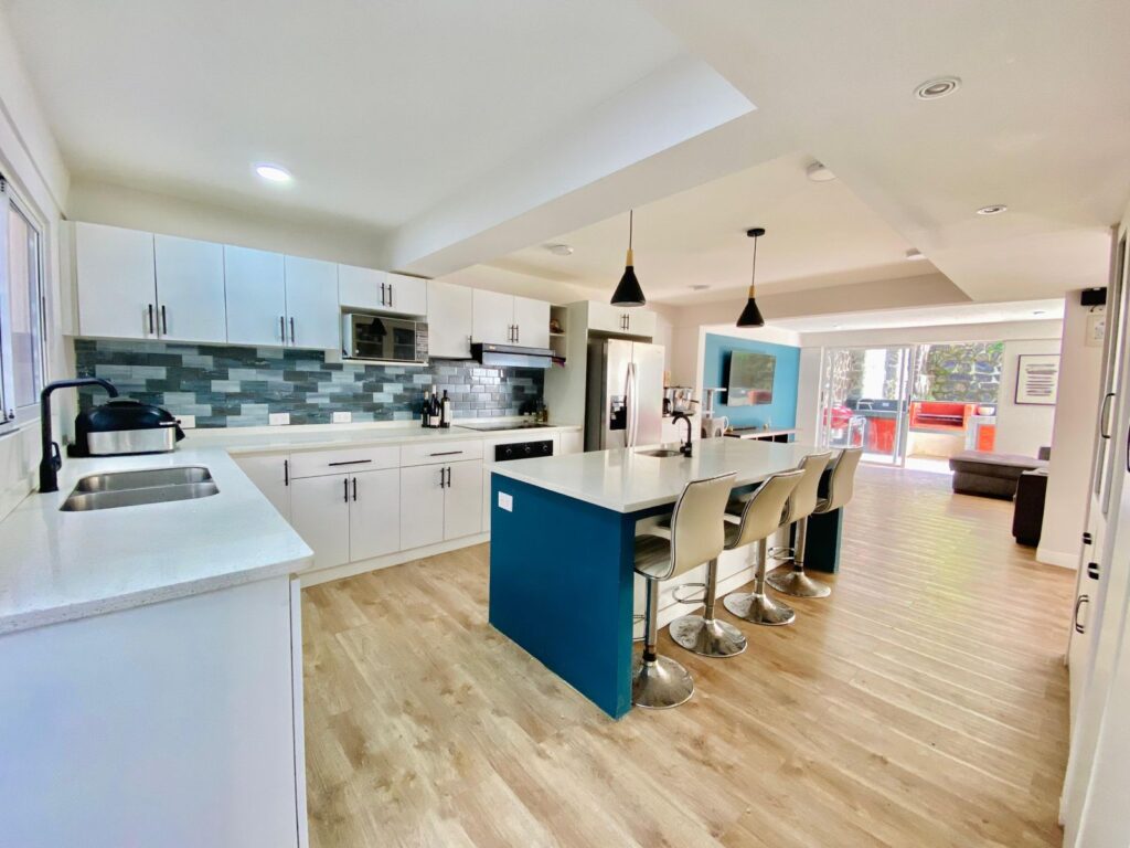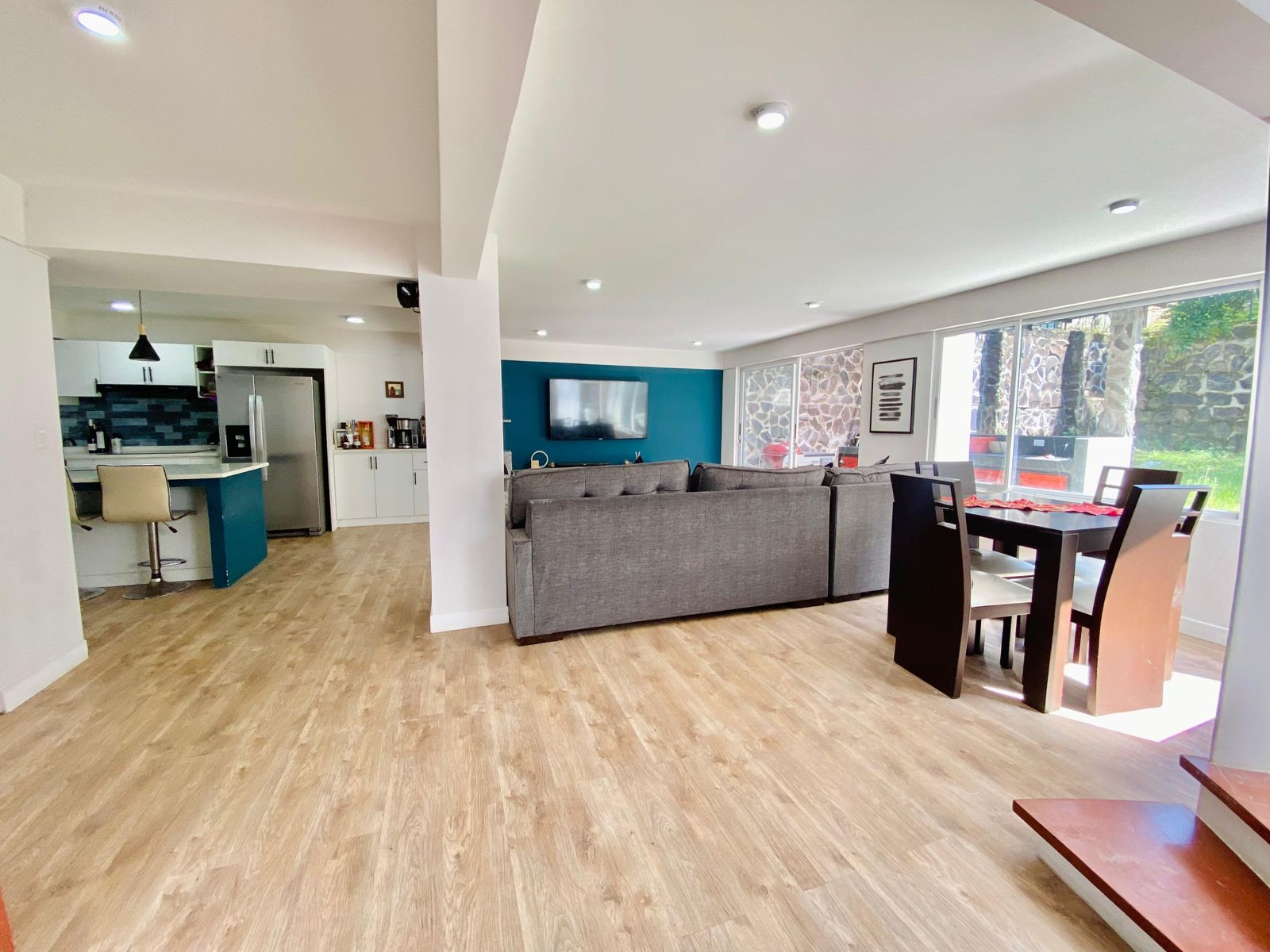 3 habitaciones con closet y A/C (principal con baño amplio y walk in closet), 2.5 baños, sala de comedor y estar, amplia cocina con muebles finos y sobres en cuarzo con isla, rancho BBQ, estufa y horno empotrados, área de lavado, terraza amplia, jardín y cochera para 2 carros con portón eléctrico.